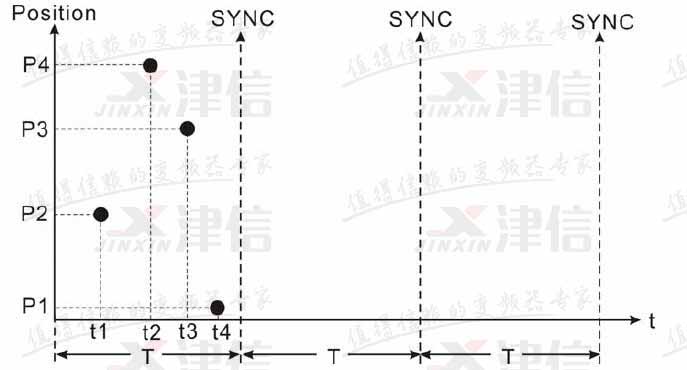 10MC 接有四臺伺服驅(qū)動器,T 為同步周期。在同步周期內(nèi),四臺伺服驅(qū)動器分別在不同的時(shí)刻(t1、t2、t3、t4)接受到控制數(shù)據(jù),但是控制數(shù)據(jù)并沒有生效。當(dāng)伺服驅(qū)動器接收到同步信號(SYNC),控制數(shù)據(jù)同時(shí)生效。