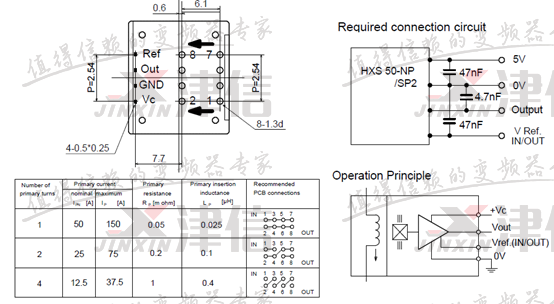3、測量三相輸出電流檢測電路,查看電流傳感器型號為HXS 50-NP,測量輸入電源只有2.4V,而HXS 50-NP正常工作的輸入電源為5V。可以確定故障點(diǎn)在此。接線圖如下: