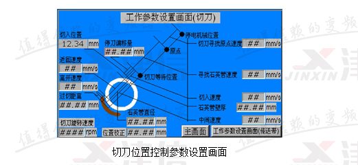 石英切割機有三個控制部分構成:切刀旋轉控制、切刀位置控制和送料位置控制。切刀旋轉控制只要速度可調即可;切刀位置控制需要在切割石英管或石英棒的過程中控制其位置和不同段內的速度,首先要保證切割產品的刀口質量,同時要提高生產效率;送料位置控制需要每次往前送設定長度的石英管或石英棒,精度要求0.2毫米。
